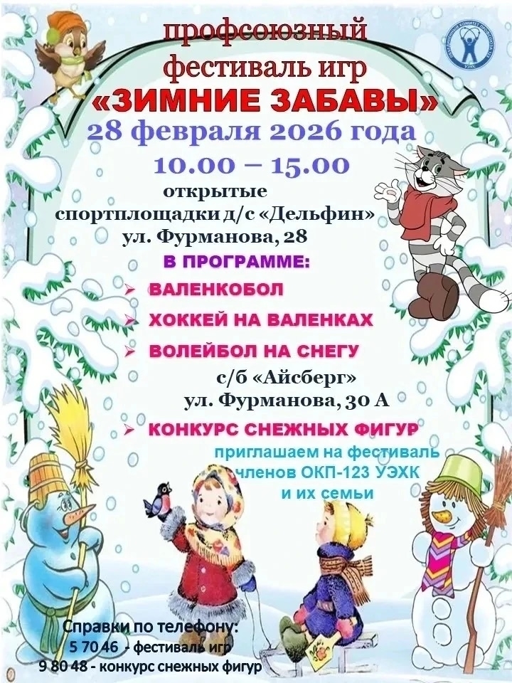 Приглашаем членов профсоюза на спортивный праздник «Зимние забавы»: 28 февраля с 10.00 до 15.00.