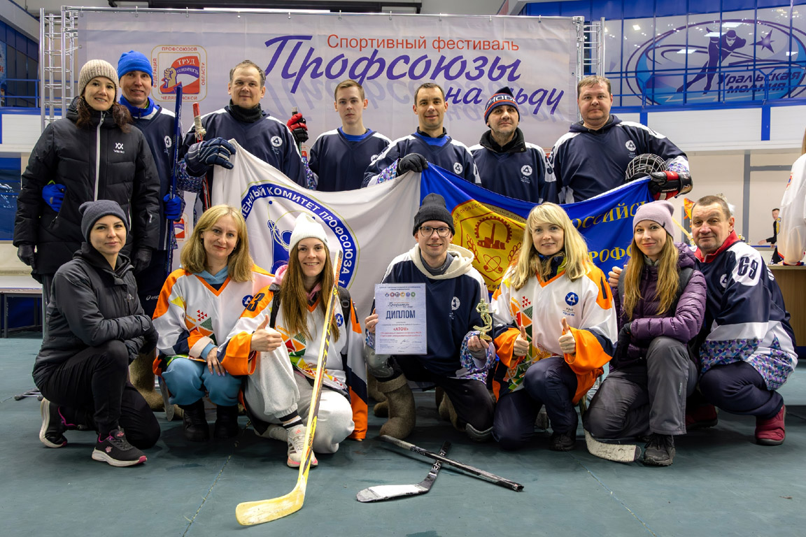 Главным событием спортфестиваля стал чемпионат по хоккею в валенках. Уже второй раз, дебютировав в 2023-м, в нём приняли участие наши коллеги! Это мужская команда «АТОМ» и женская «АТОМанки».